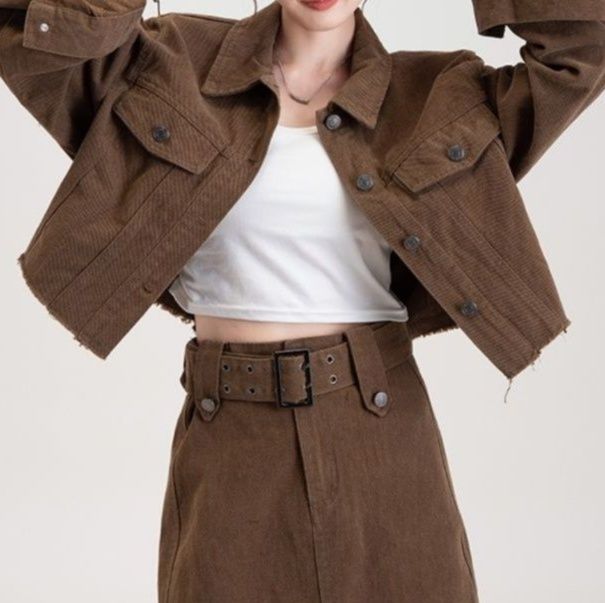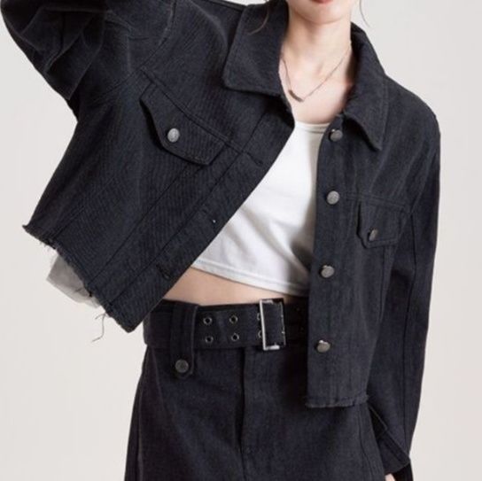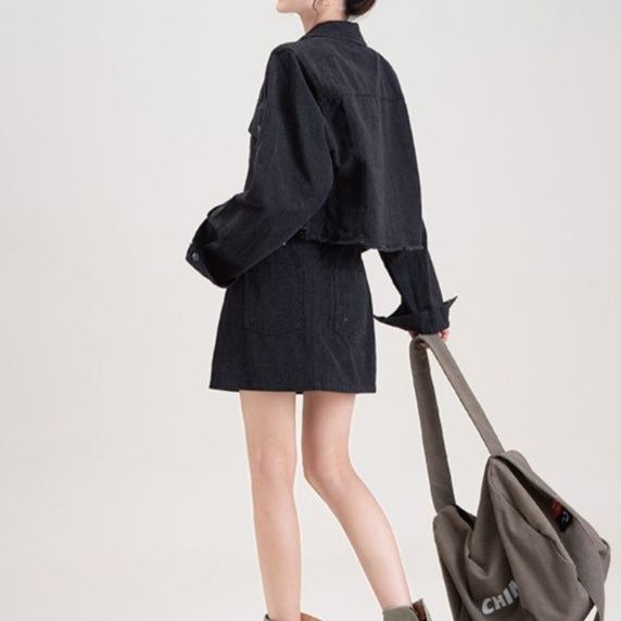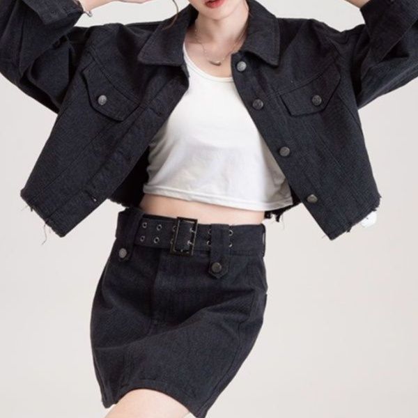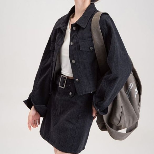 ショート丈のジャケットとミニスカートを組み合わせたデニムセットアップで、カジュアルながらも洗練された印象を演出します。