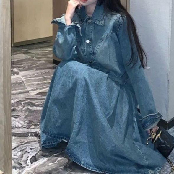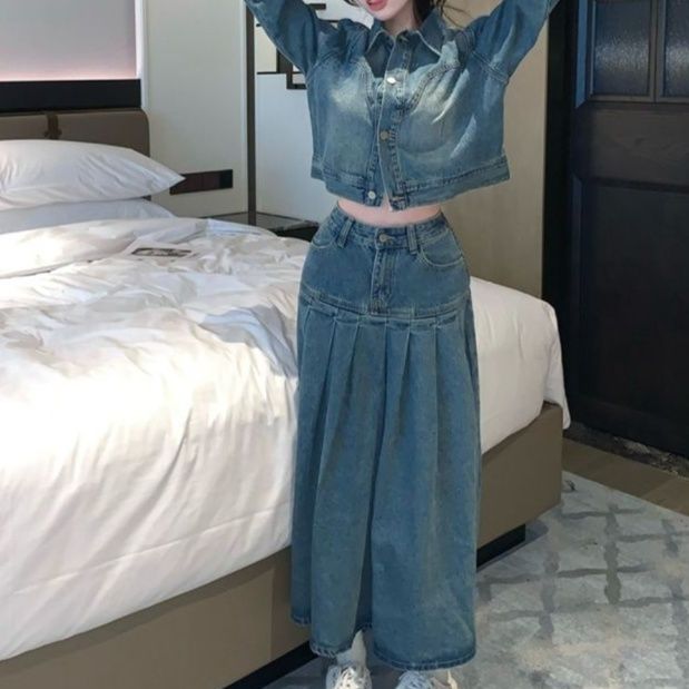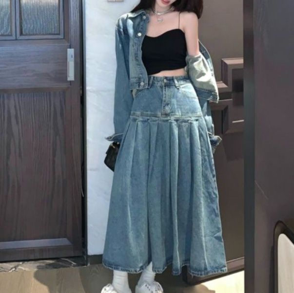 トレンド感あふれるデニムセットアップは、ショート丈のジャケットとロング丈のプリーツスカートの組み合わせが魅力です。