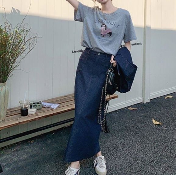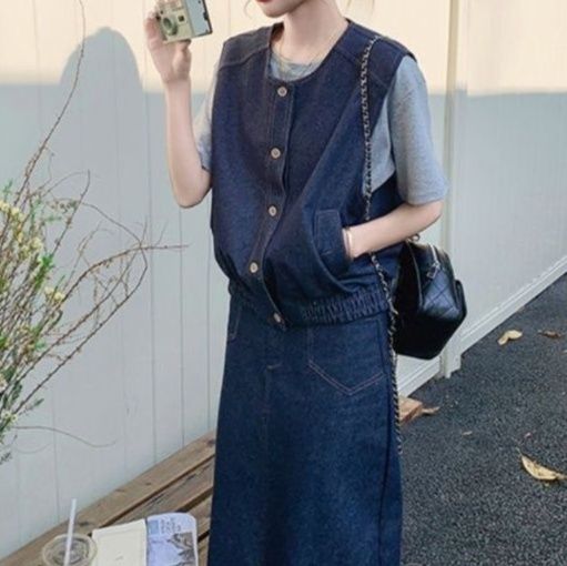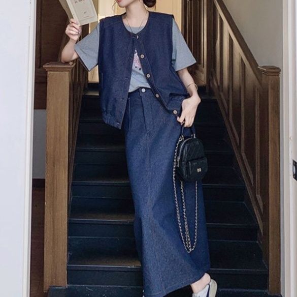しっかりとした生地感のデニム素材で、ベスト×ロングスカートの組み合わせが今どきな雰囲気を演出