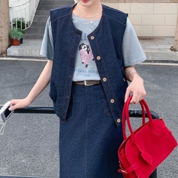 ゆったりとしたベストと縦長のスカートラインが調和し、すっきりとした着こなしに