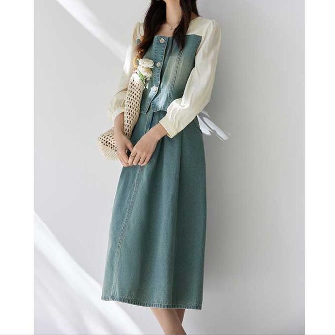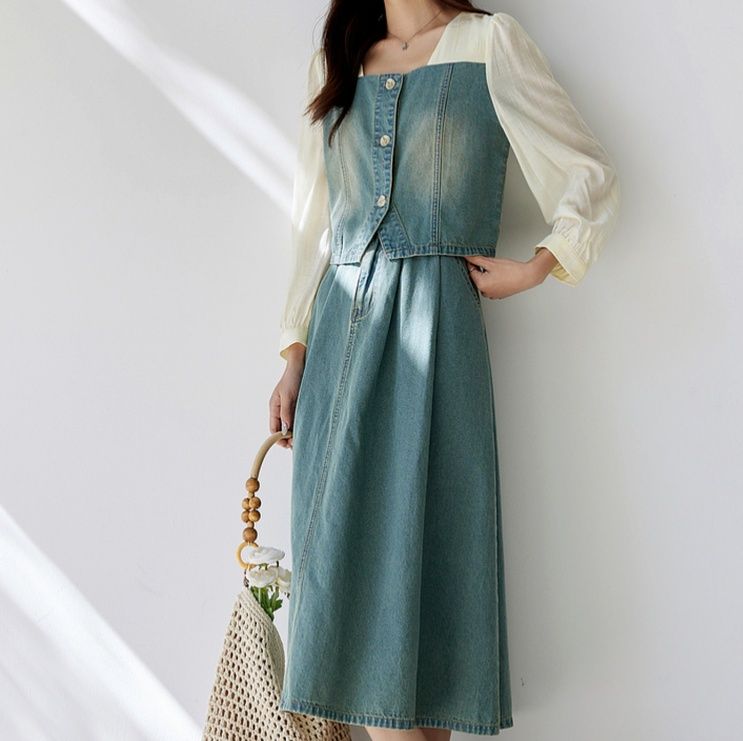 切り替えデザインのトップスとロングスカートがセットになったデニムセットアップです。