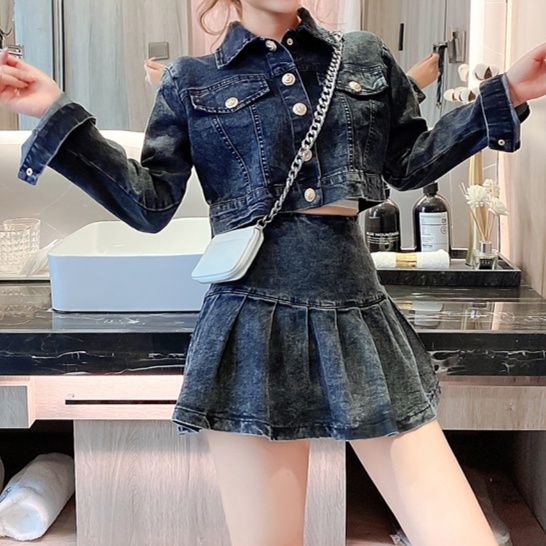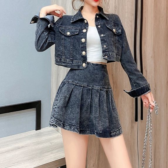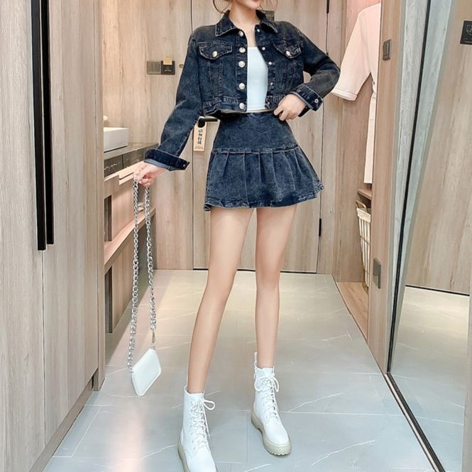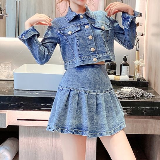 デニムセットアップの新定番、短め丈ジャケットとプリーツ入りミニスカートの組み合わせ。