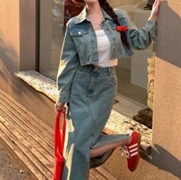ジャケットとロングスカートの組み合わせが懐かしさと今っぽさを演出