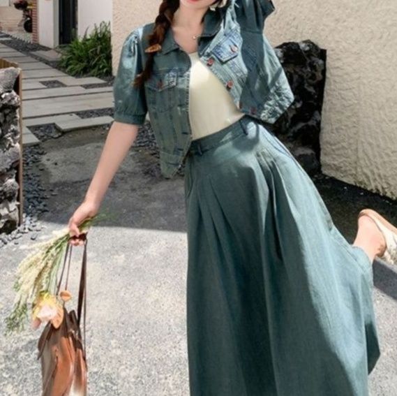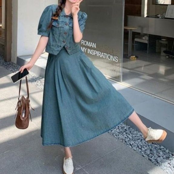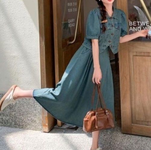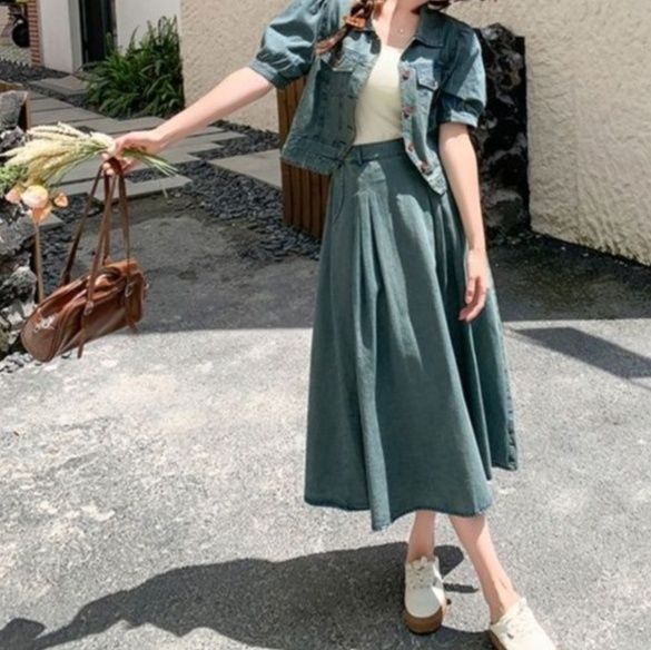 パフスリーブのジャケットとふんわりとしたロングスカートの組み合わせが上品な印象を与えます。