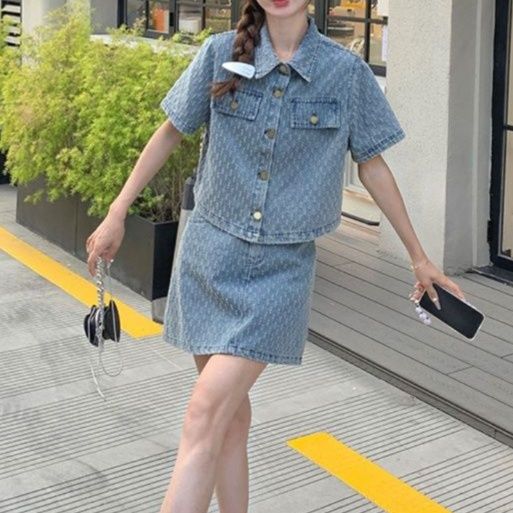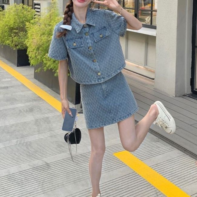 胸ポケット付きの半袖ジャケットと台形ミニスカートの組み合わせで、カジュアルながらも女性らしい印象に。