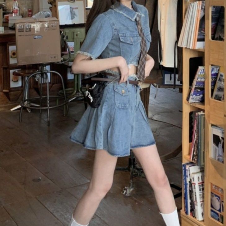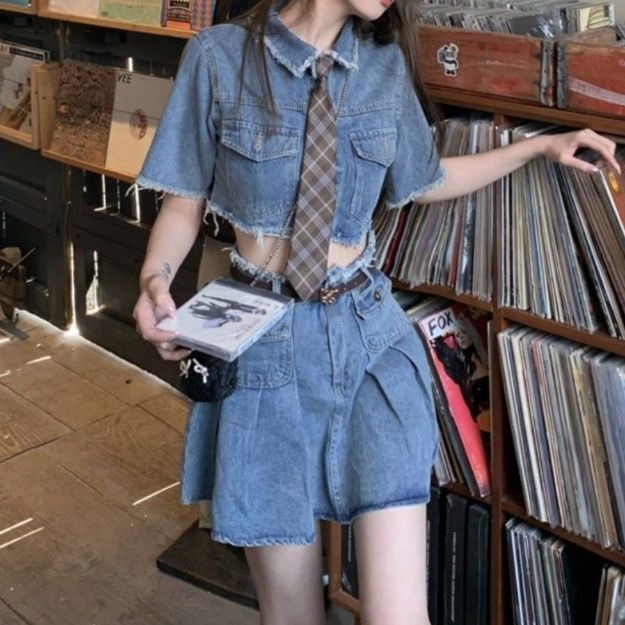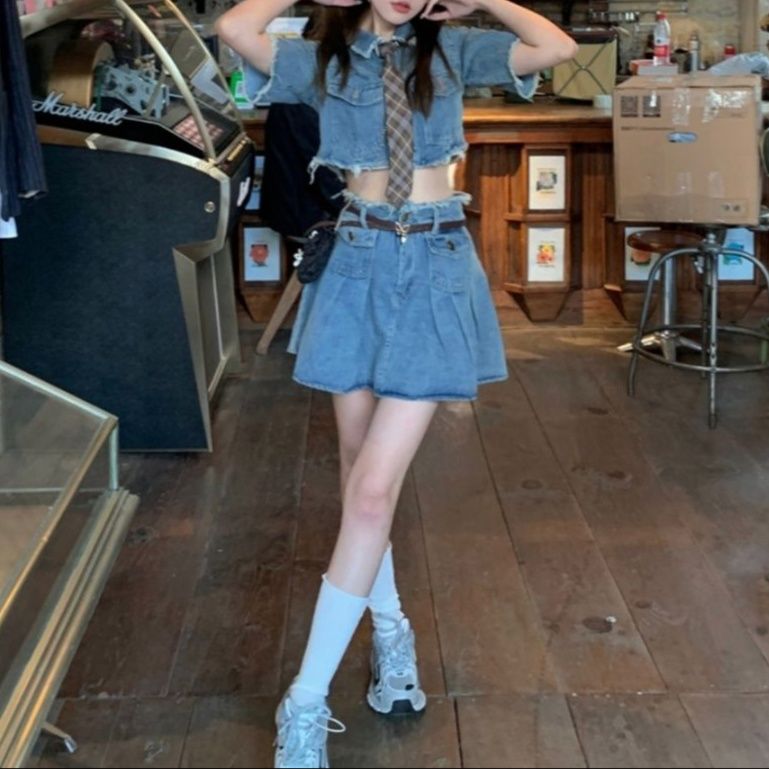 クロップドジャケットとプリーツ入りミニスカートの組み合わせが新鮮で可愛らしい印象を演出します。