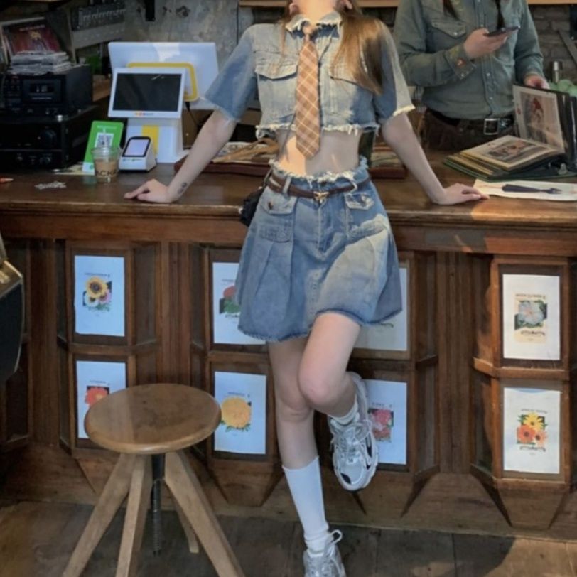 デニム素材との組み合わせで、スクールガール風の可愛らしさを表現