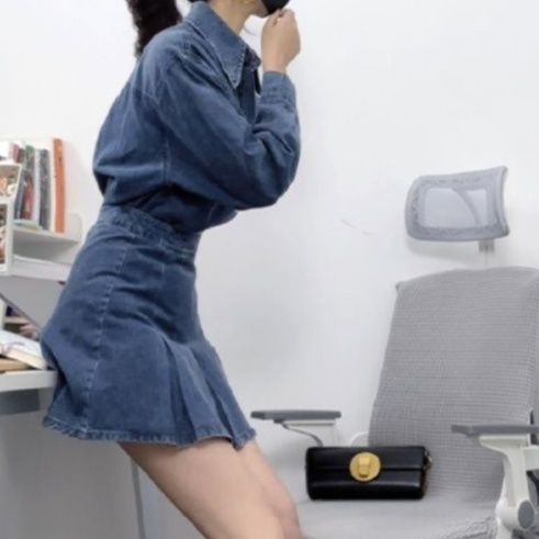 上品な雰囲気のデニムセットアップです。ゆったりとしたシルエットのシャツと、プリーツ入りのスカートが絶妙なバランス感を演出します。