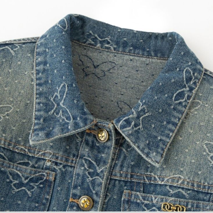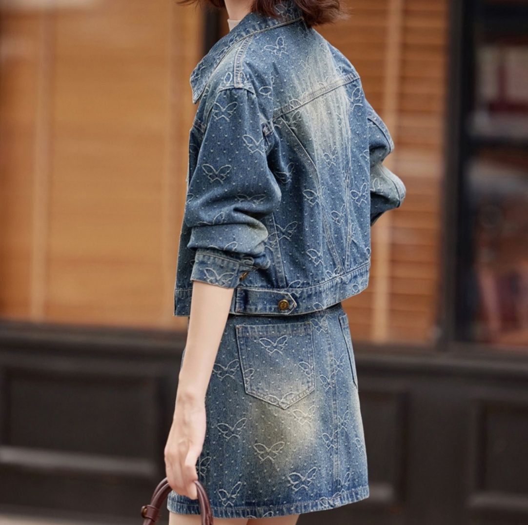 デニム全体に施された蝶の刺繍模様が上品で可愛らしい雰囲気を演出
