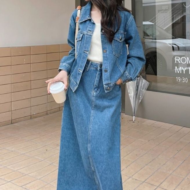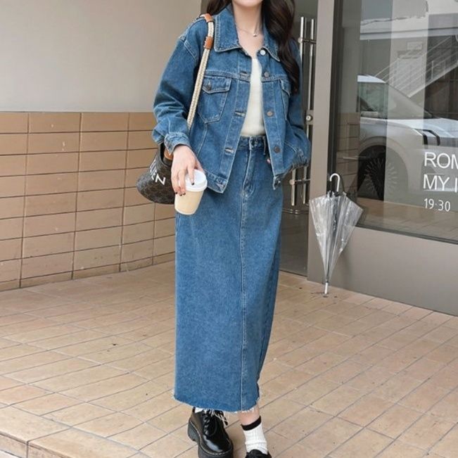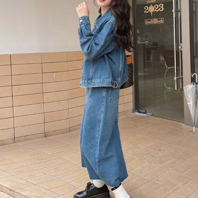 余裕のあるジャケットとロングスカートの組み合わせで、カジュアルながらも上品な雰囲気を演出します。