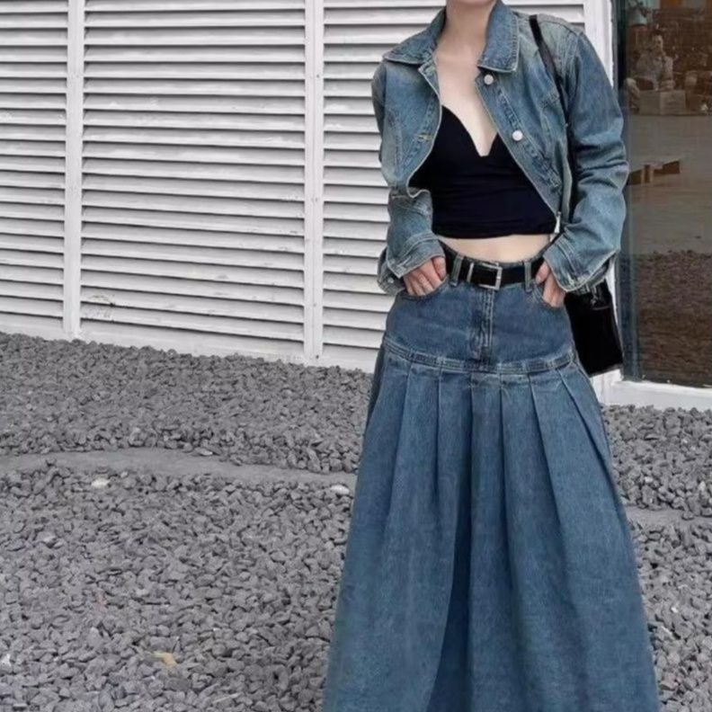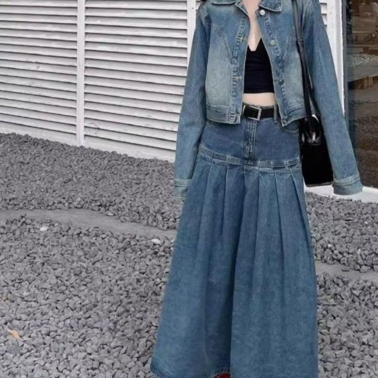 ゆったりジャケットとボリュームスカートの組み合わせが今どきの雰囲気を表現