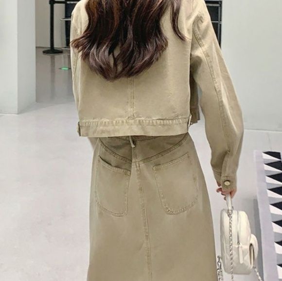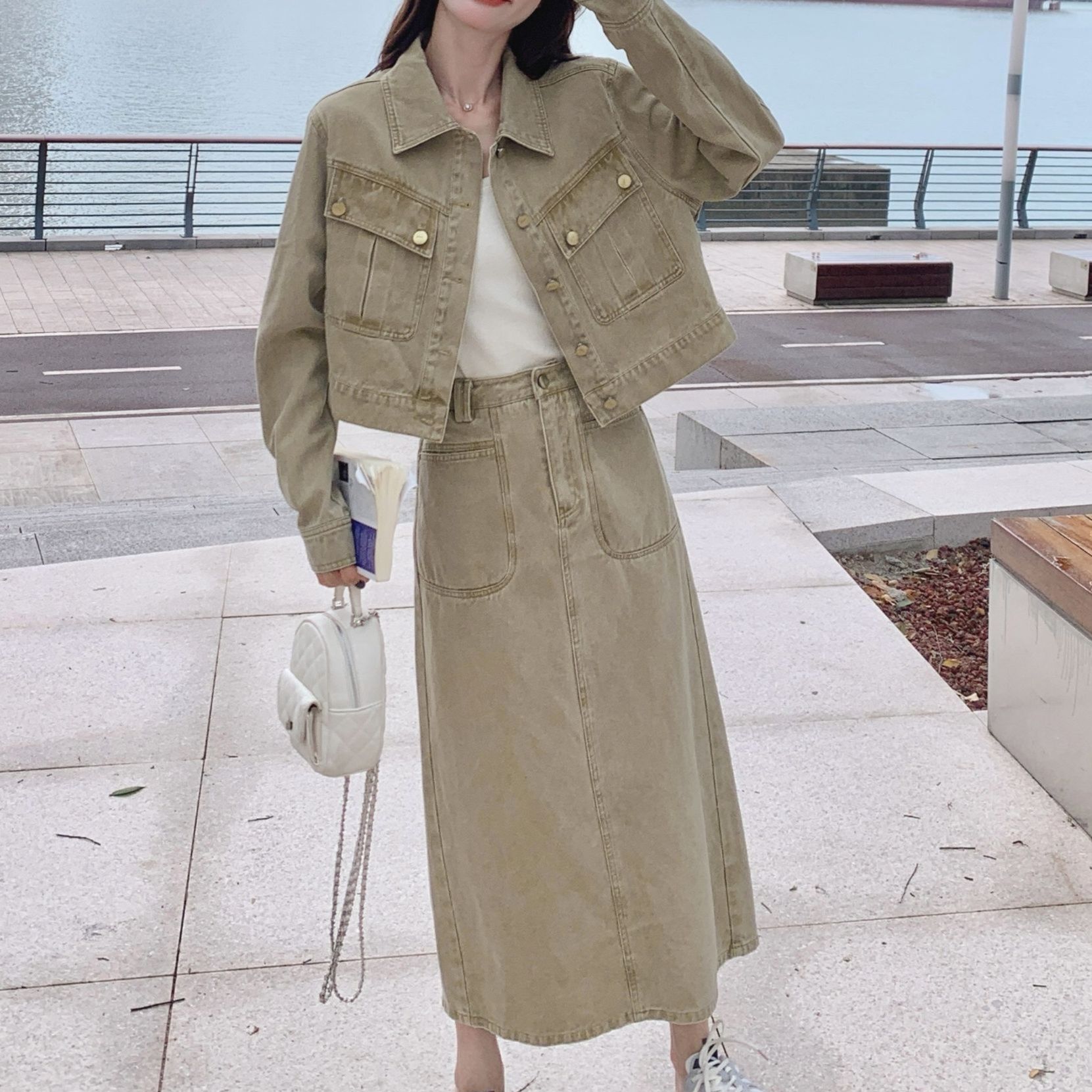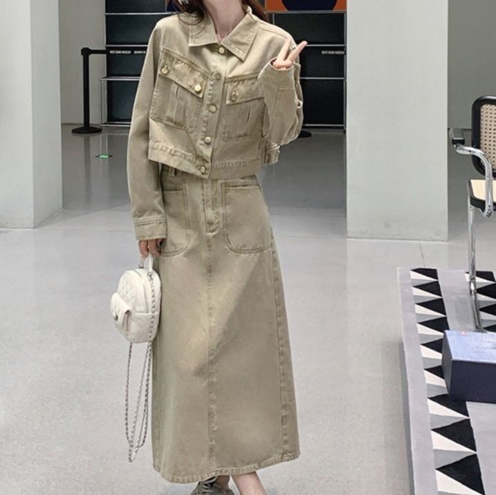 短めの丈感のジャケットと足首が見えるロング丈のスカートが絶妙なバランスを演出します。