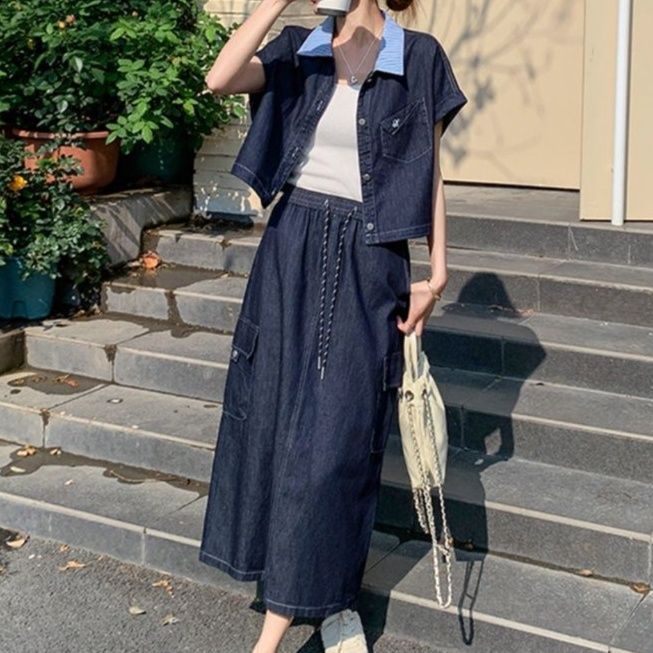 ストライプ襟がアクセントのデニムセットアップ。半袖デザインで夏にも快適な着心地を実現しました。