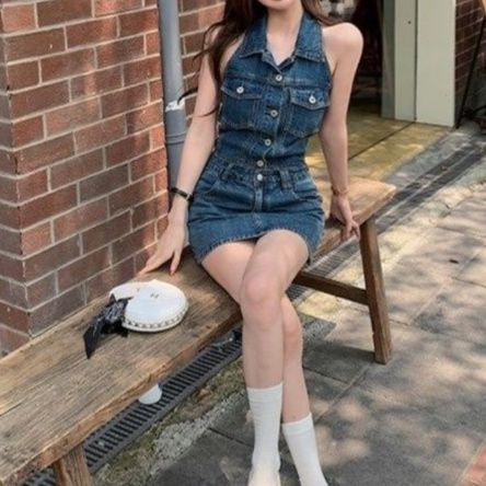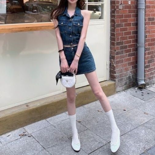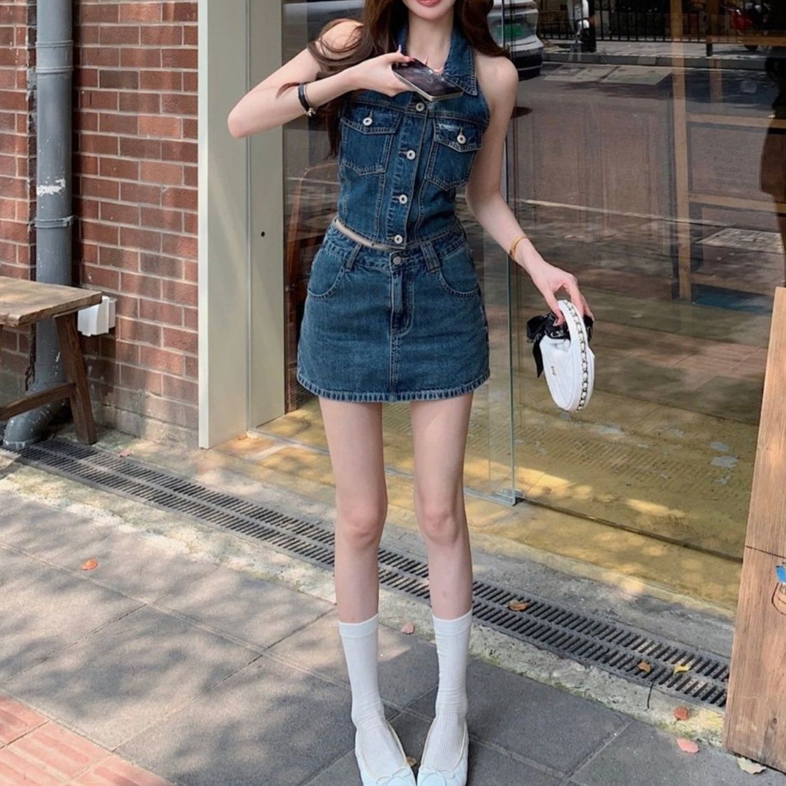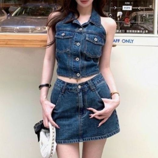 都会的な雰囲気を演出するデニムセットアップ。ノースリーブのボタン付きトップスとミニスカートの組み合わせが夏の装いを爽やかに彩ります。