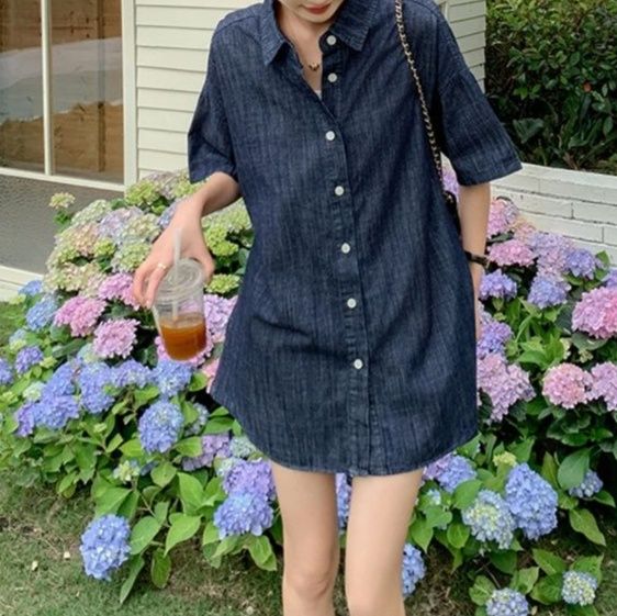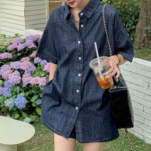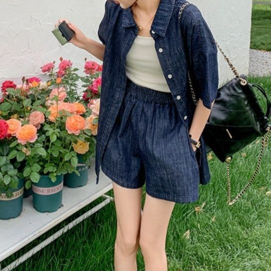 デニムセットアップの新作として登場した半袖シャツとショートパンツの組み合わせ。