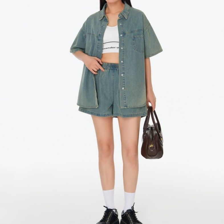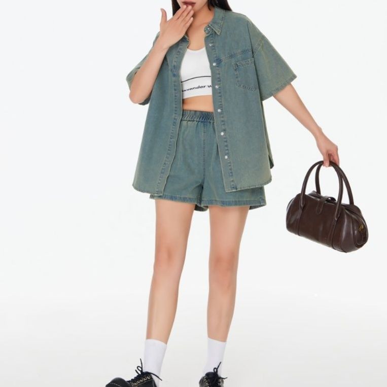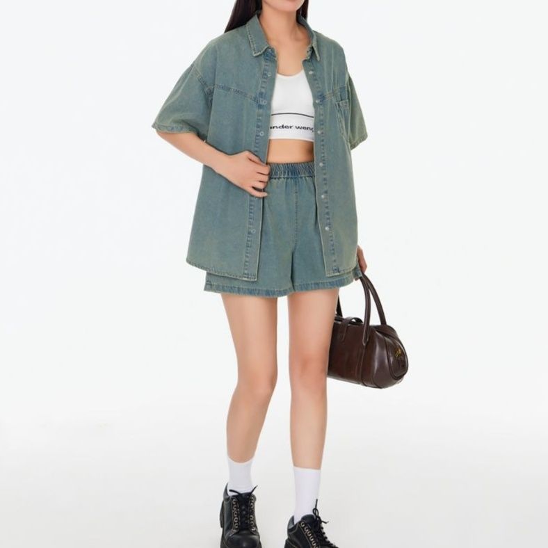 デニムセットアップの魅力を存分に引き出した半袖シャツと短パンの組み合わせ。