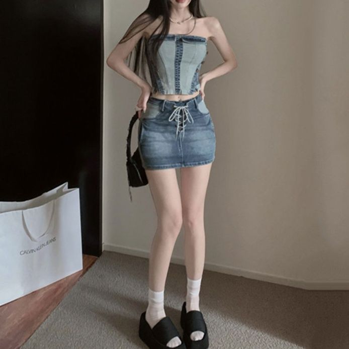 ビスチェとミニスカートが腰のラインを強調し、スタイルアップ効果を実現