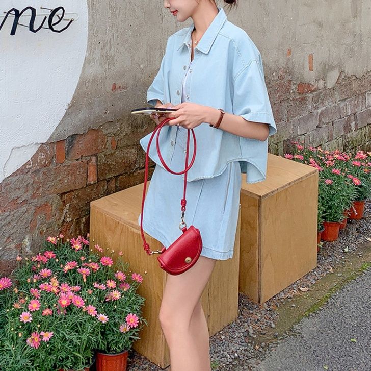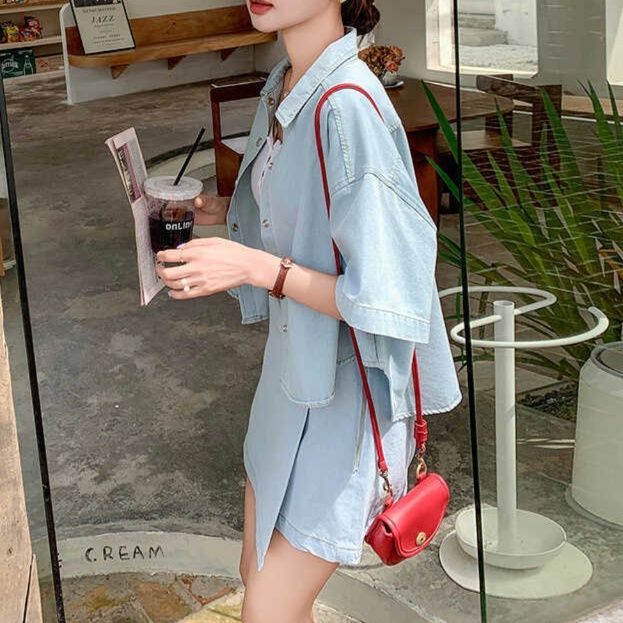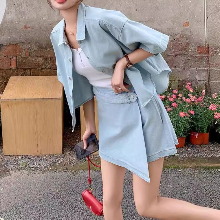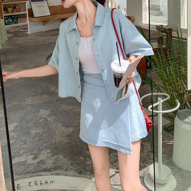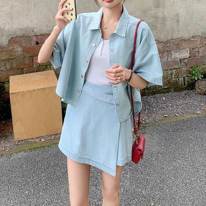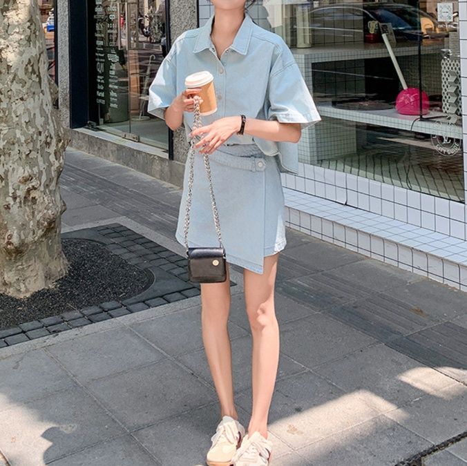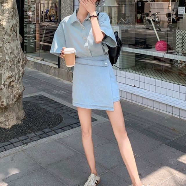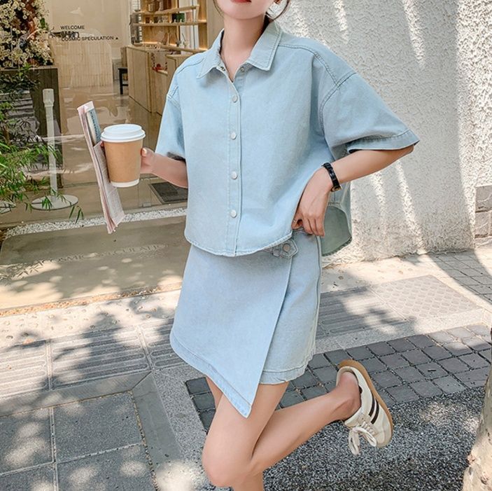 ゆったりした半袖シャツと巻きスカート風のデザインが特徴的なデニムセットアップです。