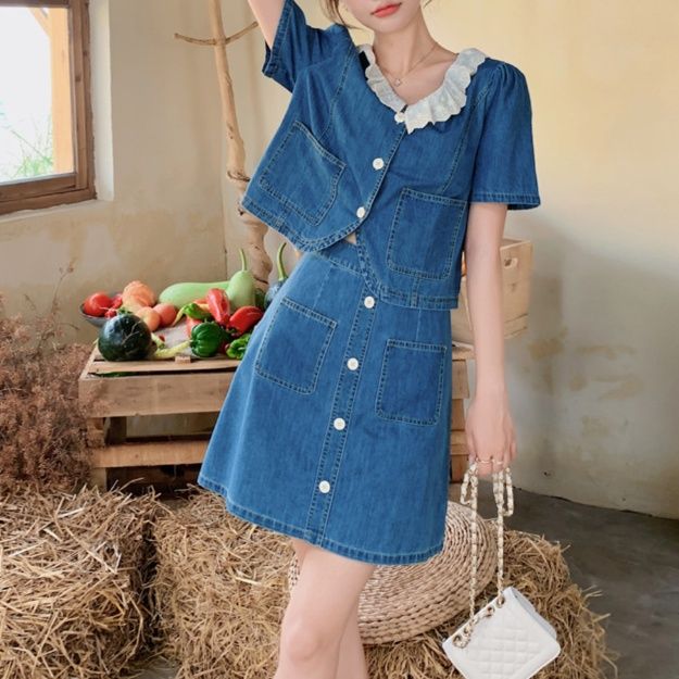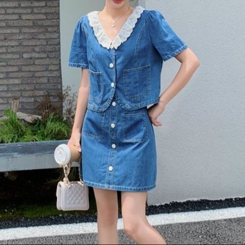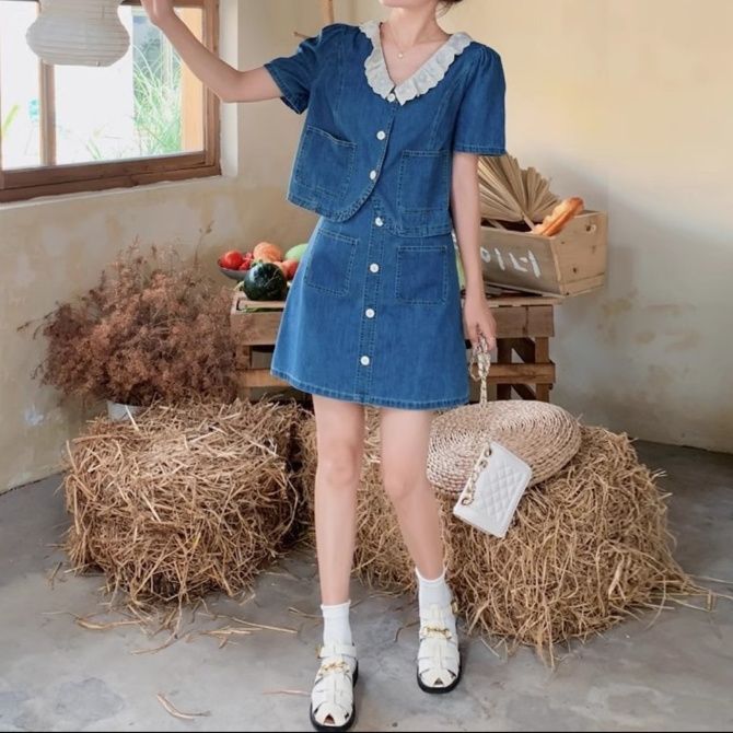 優しげな印象を与えるレース襟が特徴的なデニムセットアップです。