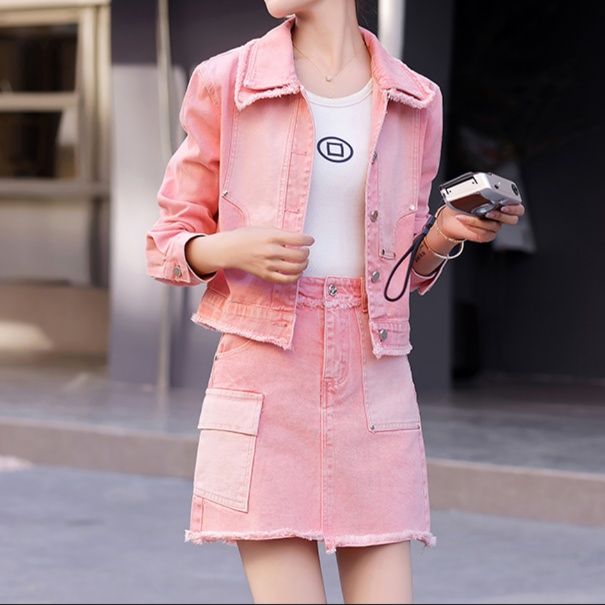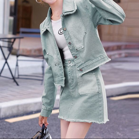 コンパクトなジャケットとフロントポケット付きのミニスカートを組み合わせた、おしゃれなスカートセットアップになっています。