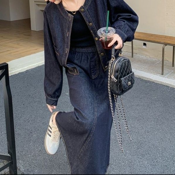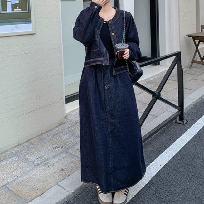 ゆったりとしたショート丈のジャケットと、フロントポケットが特徴的なロングスカートの組み合わせが洗練された印象を演出します。