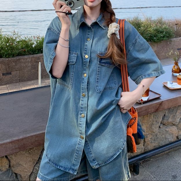 半袖のオーバーサイズシャツとショートパンツの組み合わせで、リゾート感溢れる夏のコーディネートに。