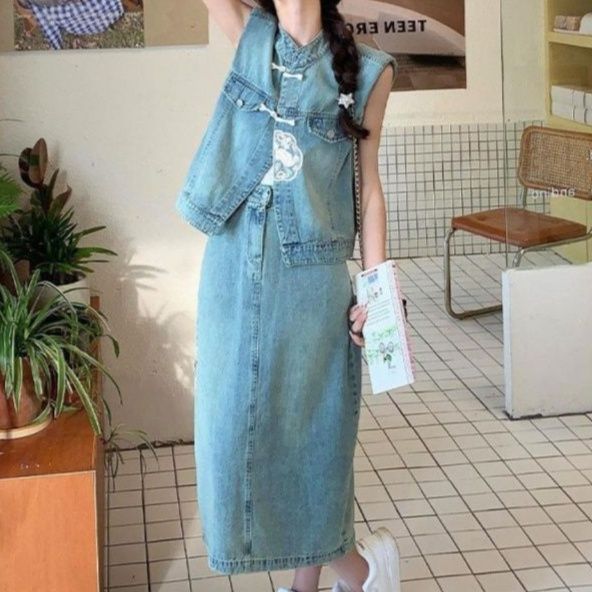 伝統的なチャイナ風ボタンと現代的なデニム素材が調和した独特なデザイン