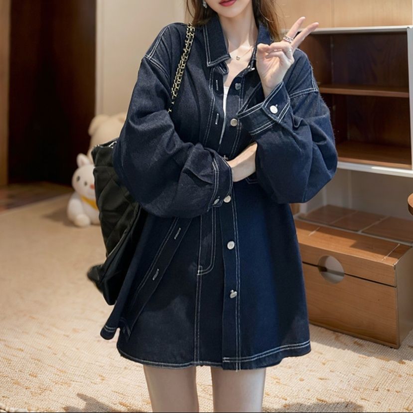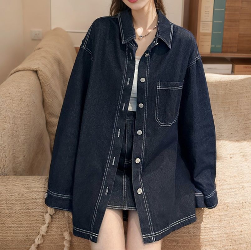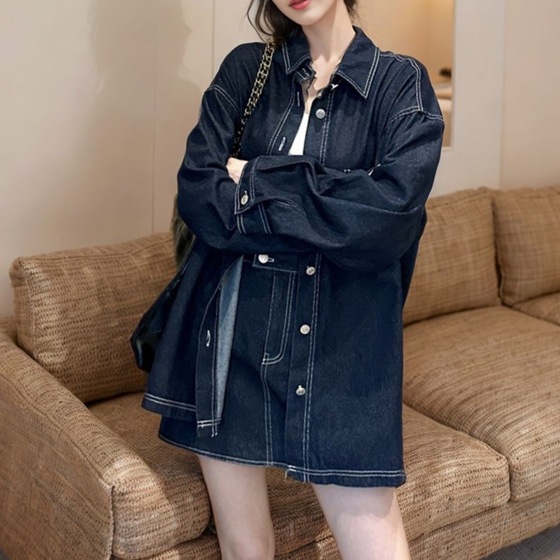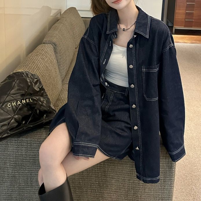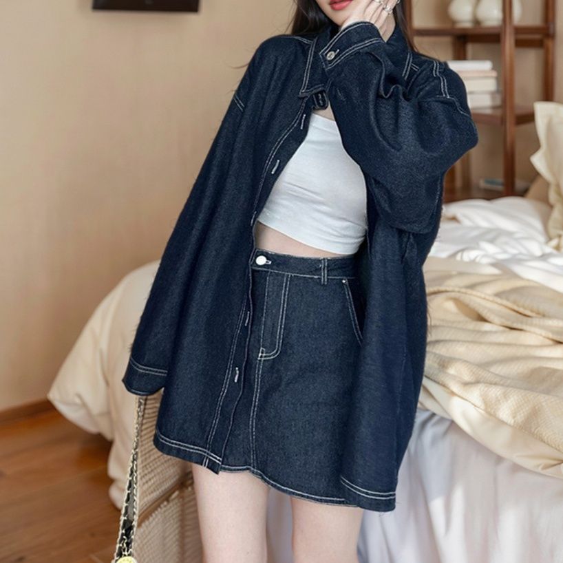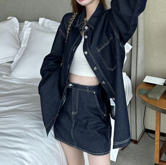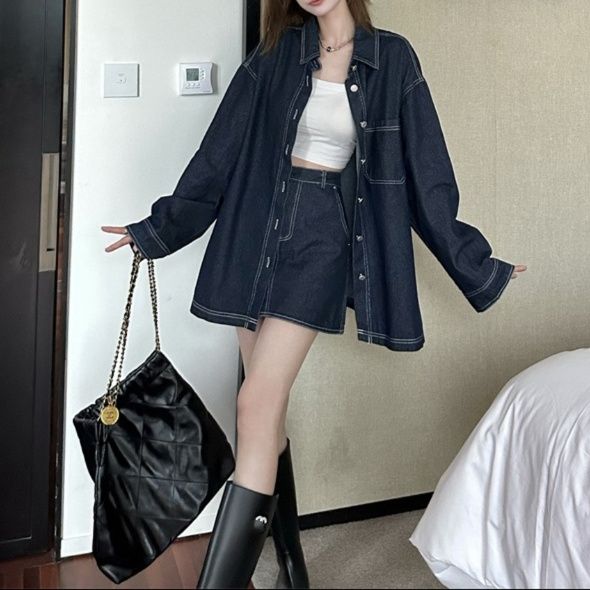 日常使いにぴったりのデニムセットアップ。ゆったりとしたシルエットのシャツジャケットとミニスカートの組み合わせが今どきの着こなしを演出。