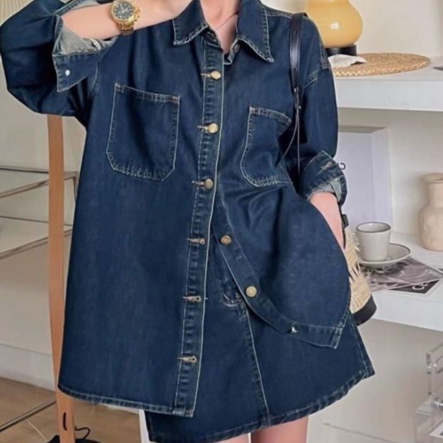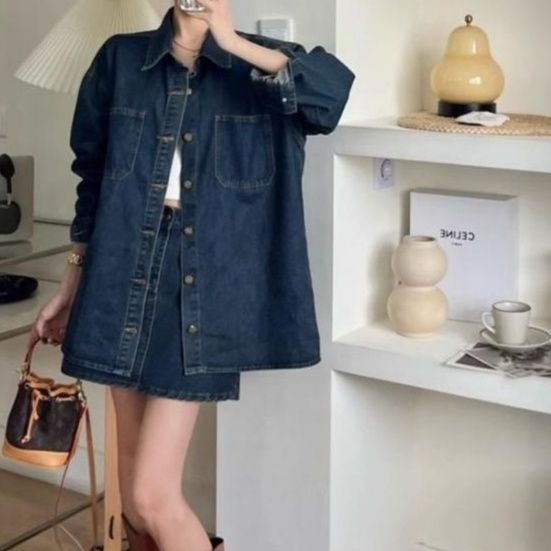 大きめシルエットのシャツジャケットと台形ミニスカートの組み合わせで、ゆったりとした着心地ながらもおしゃれ感満載。