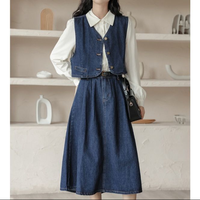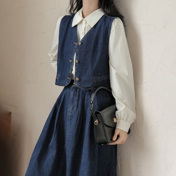 古き良き時代の雰囲気漂うデニムセットアップ。クラシカルなベストとフレアスカートの組み合わせが上品な印象を与えます。
