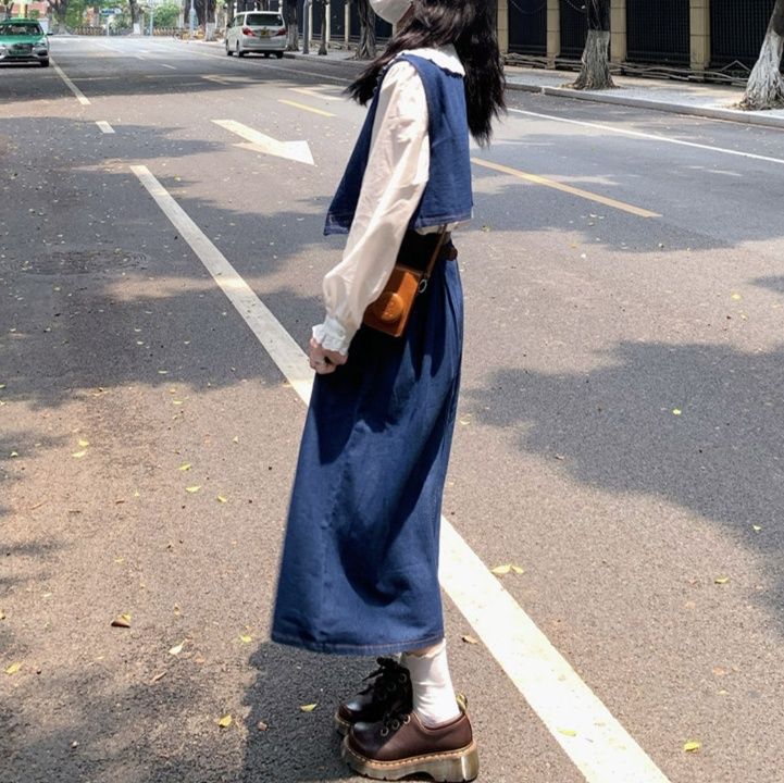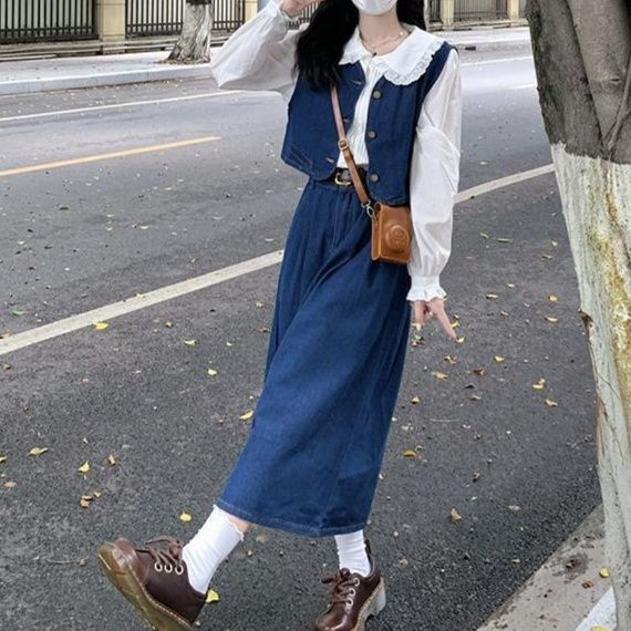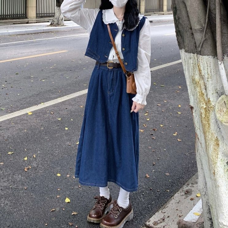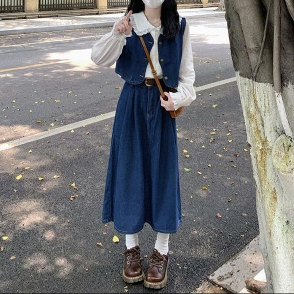 ベストはボタンで開閉でき、フレアスカートは体型カバーと女性らしさを両立させます。