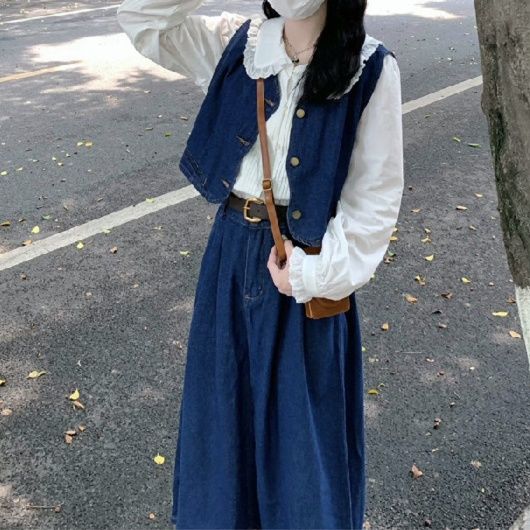 ベストと白ブラウス、スカートの組み合わせが魅力的な三点セットです。